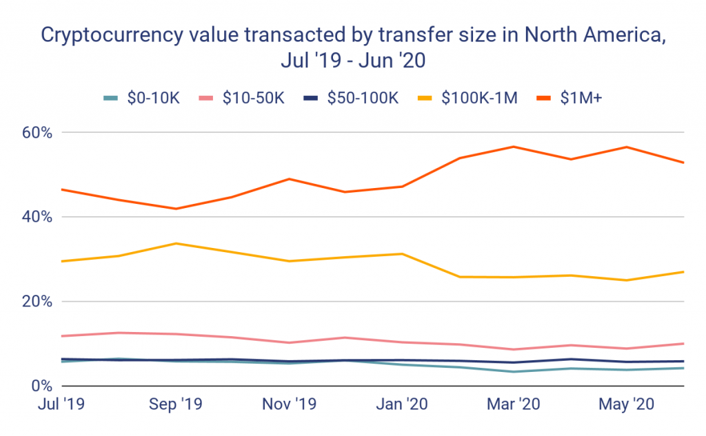 يشير حجم التحويلات أيضًا إلى تأرجح مؤسسي أكبر في أسواق البيتكوين في أمريكا الشمالية. بين ديسمبر 2019 ومايو 2020 ، ارتفعت قيمة التحويلات التي تزيد عن مليون دولار في حجم التجارة من 46 في المائة إلى 57 في المائة. وتجدر الإشارة إلى أن هذه الزيادة تقاس بالدولار ، في حين أن القيمة الفعلية لعملة البيتكوين تتأرجح بين ارتفاع يصل إلى 10000 دولار إلى 3800 دولار. خلال هذه الفترة ، ارتفعت الحصة السوقية للمستثمرين المحترفين من 87٪ إلى 92٪.