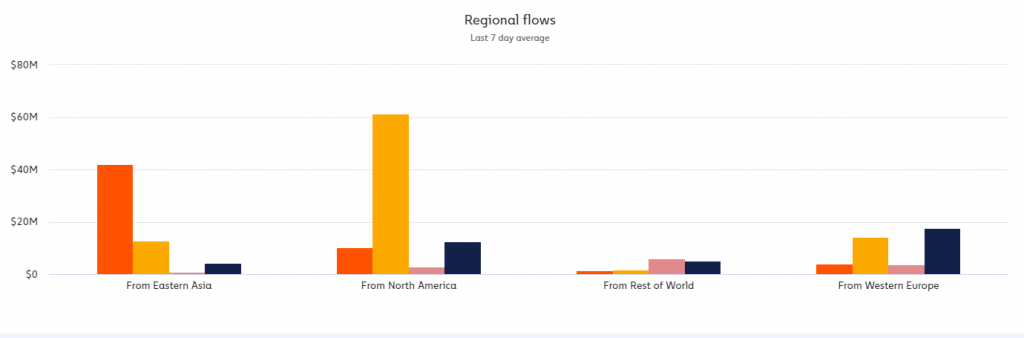من حيث المتوسط العالمي ، تعد أمريكا الشمالية ثالث أكثر المناطق نشاطًا من حيث حجم تداول العملات المشفرة. تمثل القارة 14.8 في المائة من جميع الأنشطة خلف أوروبا الغربية وشرق آسيا الرائد في السوق. ومع ذلك ، على عكس الآخرين ، فإن تجارة أمريكا الشمالية داخلية للغاية. تظهر التدفقات الإقليمية لعملة البيتكوين أن أكثر من 60 مليون دولار من عملات البيتكوين المتداولة تتدفق داخل القارة ، أي من أمريكا الشمالية إلى أمريكا الشمالية. في حين أن كل منطقة لديها تدفقات داخلية أعلى من التدفقات الخارجية ، فإن أمريكا الشمالية لديها تدفقات داخلية أكثر من البقية.