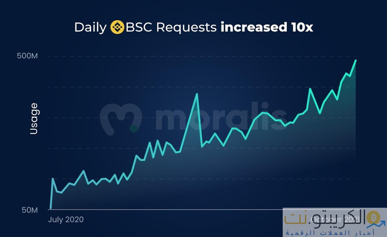 بالإضافة إلى ذلك ، لا يبدو أن هذا الاهتمام بـ BSC يتضاءل لأن طلبات السلسلة الذكية من خلال Moralis قد وصلت إلى ما يقرب من 500 مليون ، بزيادة قدرها 10x منذ يوليو 2020. ما يشير إليه هذا هو أن هذه الفرق كانت نشطة باستمرار.