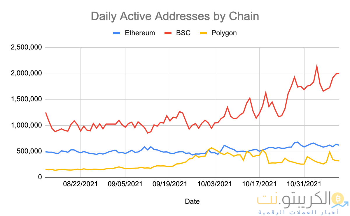يبلغ عدد العناوين الموجودة على 114 مليون عنوان ، وتستمر الشبكة في إضافة أكثر من 330 ألف عنوان يوميًا. وهذه ليست عناوين FOMO أيضًا. إذا نظرت إلى العناوين النشطة اليومية على BSC ، فإن الرقم تجاوز للتو علامة 2 مليون قبل أيام قليلة.
