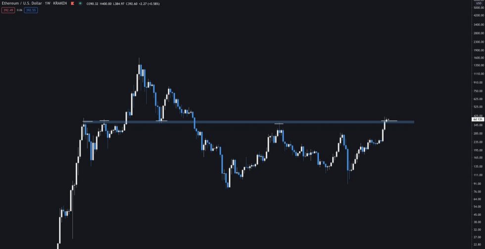 بالأمس ، صعد المضاربون على ارتفاع ETH وأرسلوا العملة المشفرة للارتفاع نحو 400 دولار – وهو مستوى المقاومة الرئيسي.