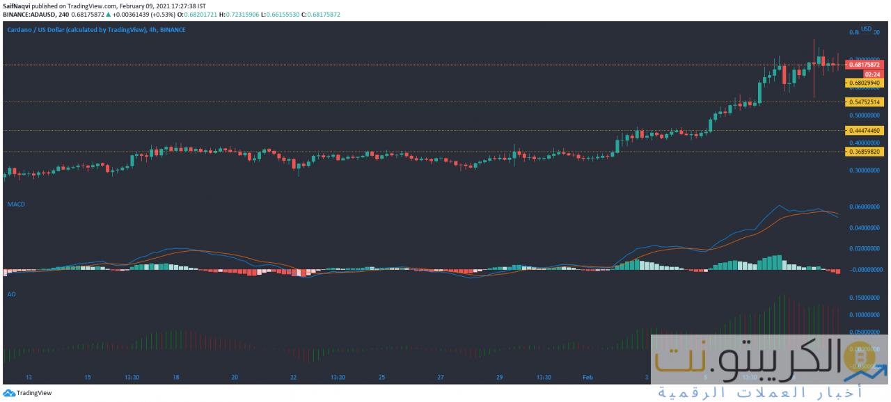 كانت أحجام التداول على مدار 24 ساعة ، والتي تقلصت بنسبة 20٪ تقريبًا ، بمثابة مقدمة للتصحيح المتوقع. تم العثور على مستويات الدعم عند 0.54 دولار و 0.44 دولار في حالة الانخفاض. في الواقع ، قد يشير الانخفاض نحو علامة الدعم الأخيرة إلى بداية اتجاه هبوطي على المدى القصير إلى المتوسط.