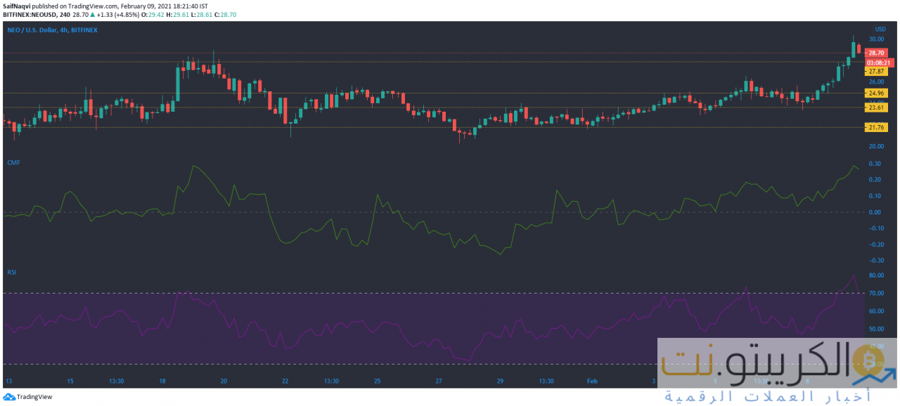 صعد Neo إلى أعلى مستوى محلي بأكثر من 29 دولارًا على خلفية الإشارات الصعودية من السوق الأوسع ، وهو المستوى الذي شوهد آخر مرة في أغسطس 2018. تدفق المال Chaikin سجلت تدفقات رأسمالية قوية إلى سوق العملات المشفرة. اقترح CMF ، إلى جانب أحجام التداول الصحية وزيادة نشاط الشراء ، أن NEO قد تقطع علامة 30 دولارًا خلال الجلسات القليلة المقبلة.