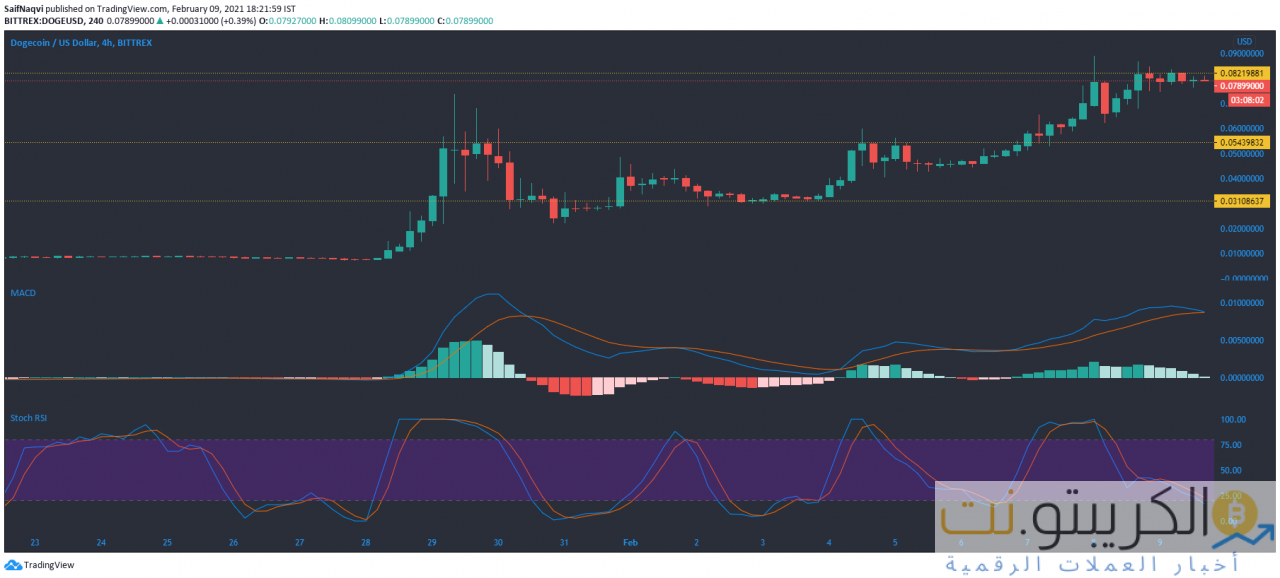 ارتفعت عملة Dogecoin بنسبة 9٪ إضافية خلال الـ 24 ساعة الماضية ووضعت نفسها بين أفضل 10 عملات في السوق بقيمة سوقية تزيد عن 10.3 مليار دولار. شوهدت بعض الحركة الجانبية خلال الجلسات القليلة الماضية حيث تم تداول السعر بالقرب من المقاومة 0.082 دولار. ألمحت المقاييس على السلسلة إلى انعكاس مثل MACD كان على وشك التقاطع الهبوطي ، بينما كان مؤشر ستوكاستيك القوة النسبية تتطلع إلى منطقة ذروة البيع. في حالة السقوط ، يمكن أن يسلط الضوء على الدعم عند 0.054 دولار.