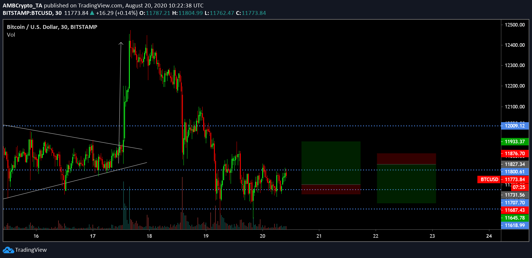 بالنظر إلى حقيقة أن البيتكوين كانت تتعافى من قاعها البالغ 11،574 دولارًا بالفعل ، فإن التحول المنطقي سيكون إعادة اختبار 12000 دولار مرة أخرى على الرسوم البيانية. للأسف ، في وقت كتابة هذا التقرير ، كانت EMAs تخيم اتجاهًا محددًا لعملة البيتكوين في المستقبل القريب.