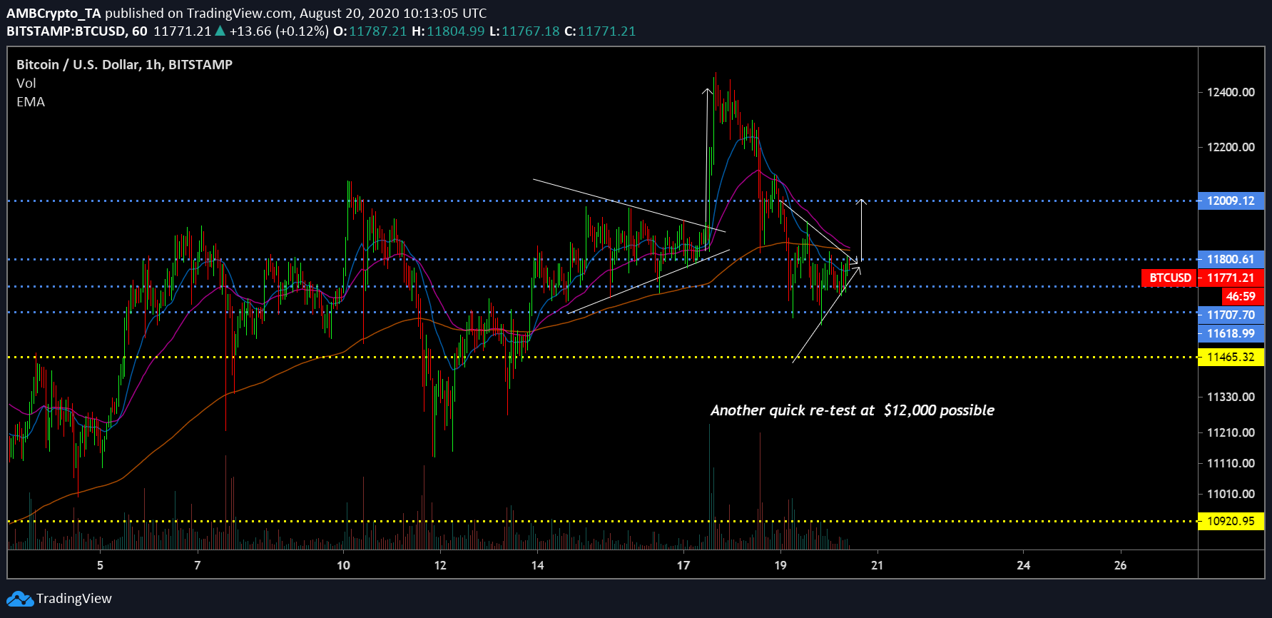 كان هناك بعض الأشياء التي يجب أخذها في الاعتبار خلال الأسبوع الماضي. بادئ ذي بدء ، حدث الاختراق الصعودي السابق الذي جعل سعر BTC أعلى من 12000 دولار بعد أن اخترق الأصل المشفر نمط المثلث المتماثل. خلال مسار النمط الأول ، كانت المتوسطات المتحركة الأسية 20 و 50 و 100 (EMA) موجودة كدعم أساسي للرمز المميز.
