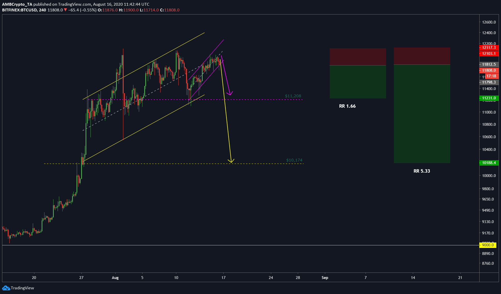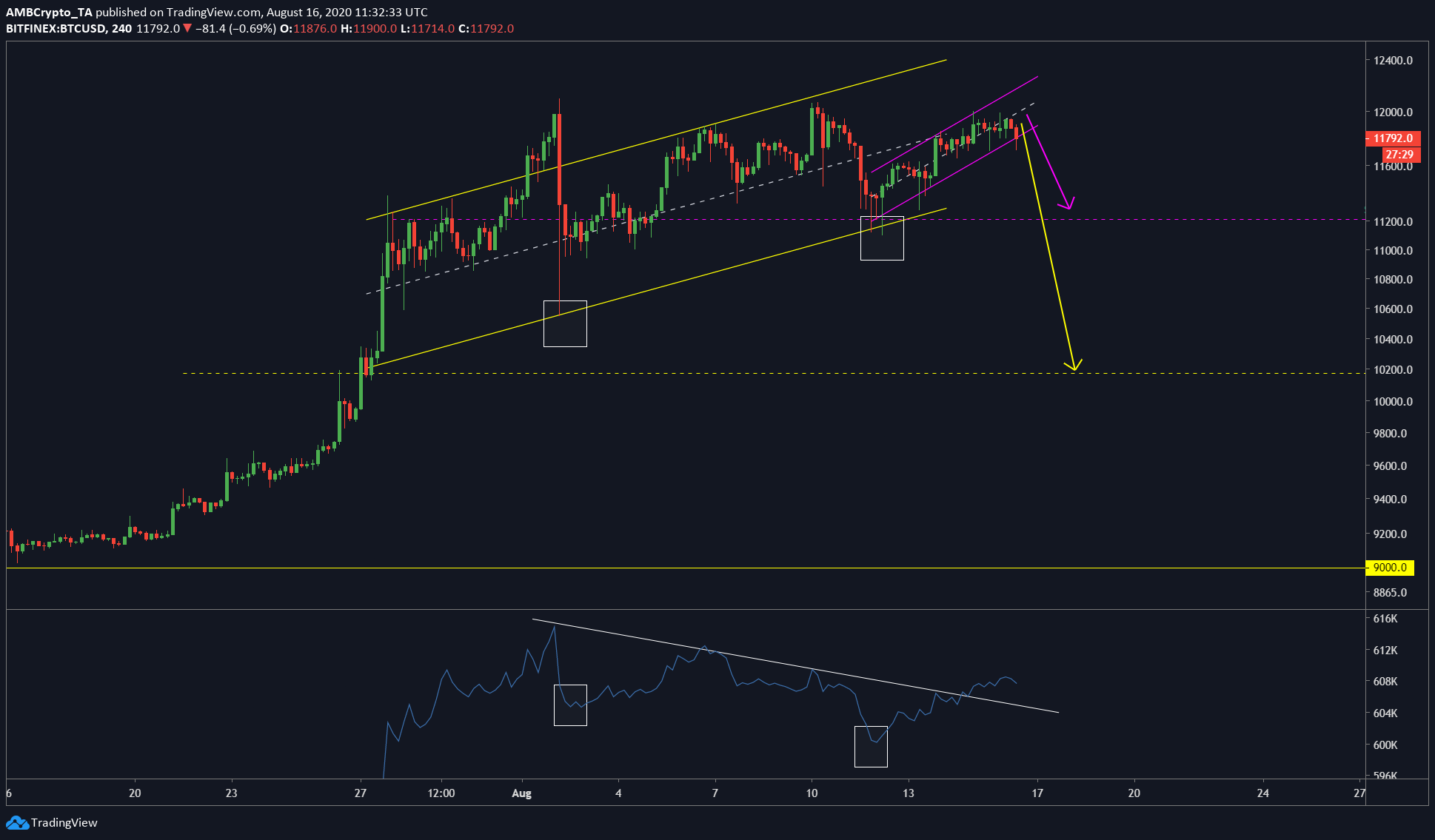 ابتداء من 2 أغسطس ، القناة الصاعدة الموازية [yellow channel] تم التأكيد ومع استمراره ، شكلت عملة البيتكوين قاعًا آخر في 11 أغسطس. يشير القاعان جنبًا إلى جنب مع مؤشر OBV معًا إلى تأرجح صعودي لعملة البيتكوين. حدث هذا الارتفاع الصعودي أيضًا في شكل قناة صعودية [pink channel].