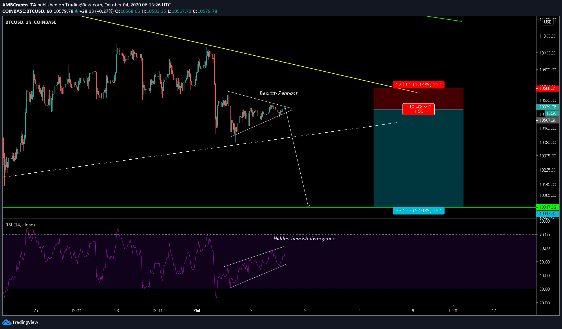 سيؤدي كسر هذا النمط إلى دفع السعر للأسفل بنسبة 4-5٪ أخرى وسيلامس السعر 10000 دولار. وهذا يستدعي صفقة بيع جيدة مع دخول عند 10567 دولارًا وإيقاف الخسارة عند 10688 دولارًا. سيكون جني الأرباح عند 10.0017 دولار أو 5.21٪ أقل من نقطة الدخول.