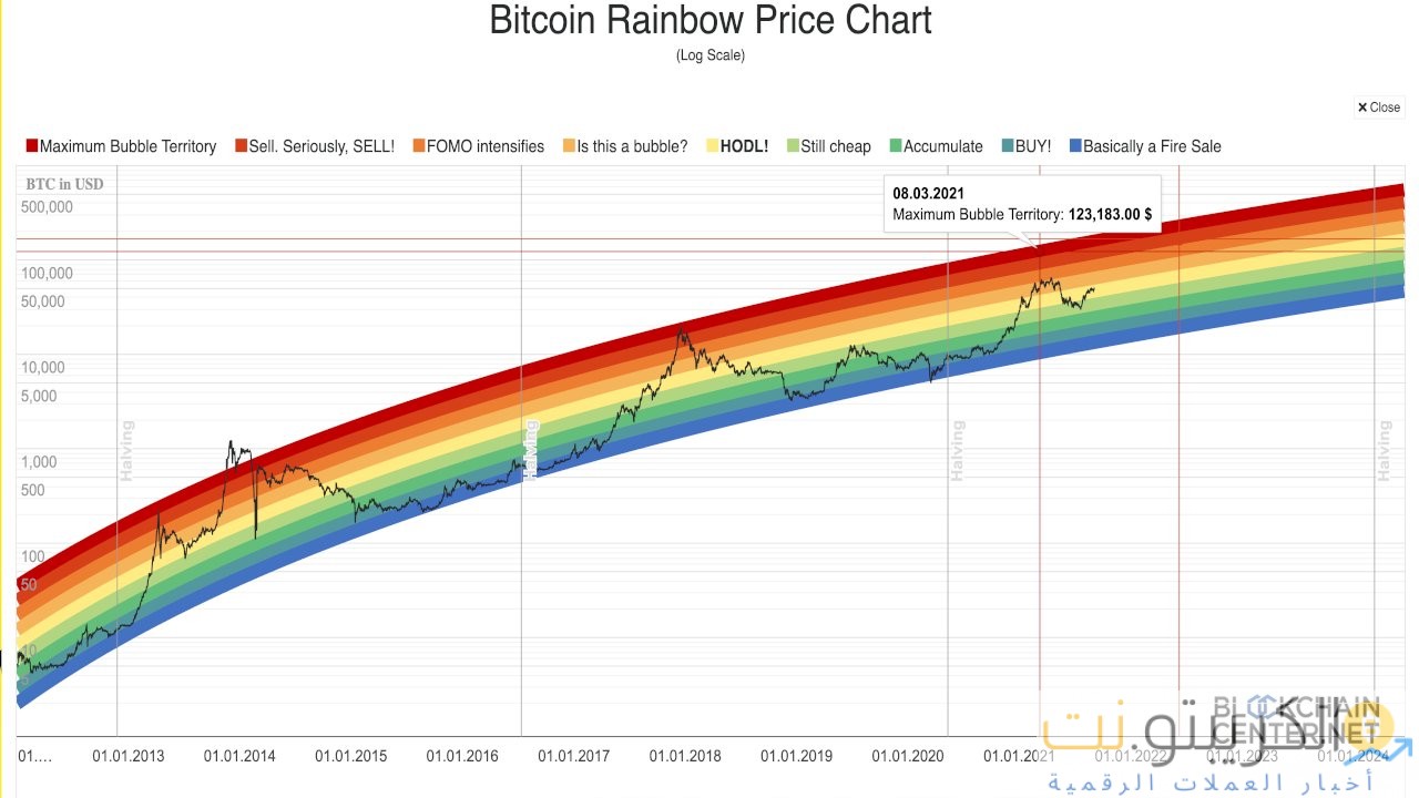 من الغريب أن سعر BTC على مخطط سجل قوس قزح لم يتدخل أبدًا في منطقة البيع حتى مرة واحدة خلال هذه الدورة. كما يمكن ملاحظته من الرسم البياني أدناه ، فقد حدث خلال معظم الدورات الأخرى. ومع ذلك ، تجدر الإشارة إلى أن السعر قد اتخذ بالفعل خطوة من منطقة “الرخيص” إلى منطقة “HODL” وهو على وشك اقتحام منطقة “الفقاعة”.