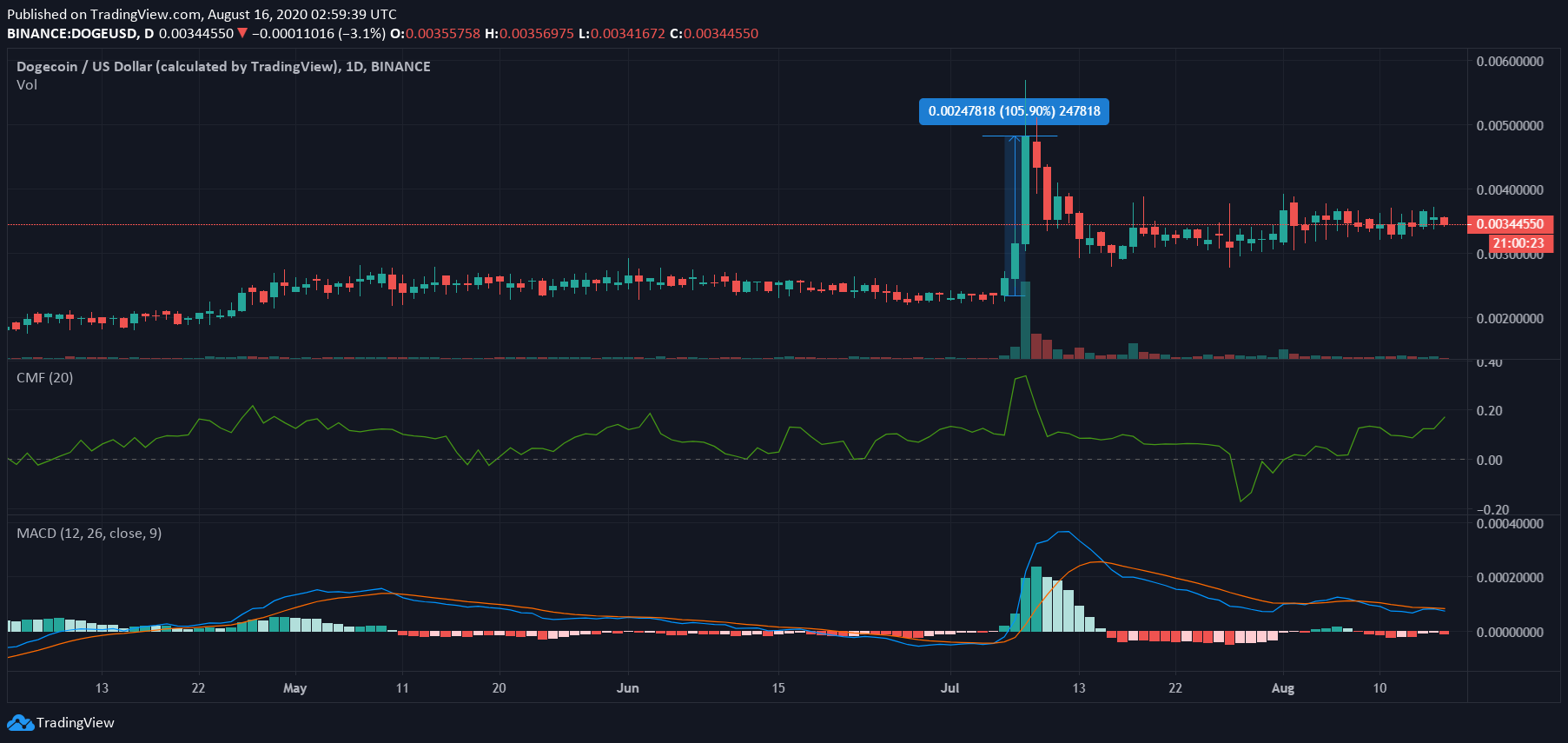ومع ذلك ، لم تكن المؤشرات الفنية لـ DOGE هبوطية للغاية. كان خط MACD متشابكًا مع خط الإشارة على الرسوم البيانية ، وكان Chaikin Money Flow يتسلق نحو 0.20 ، وهي علامة على تزايد تدفقات رأس المال إلى سوق DOGE.