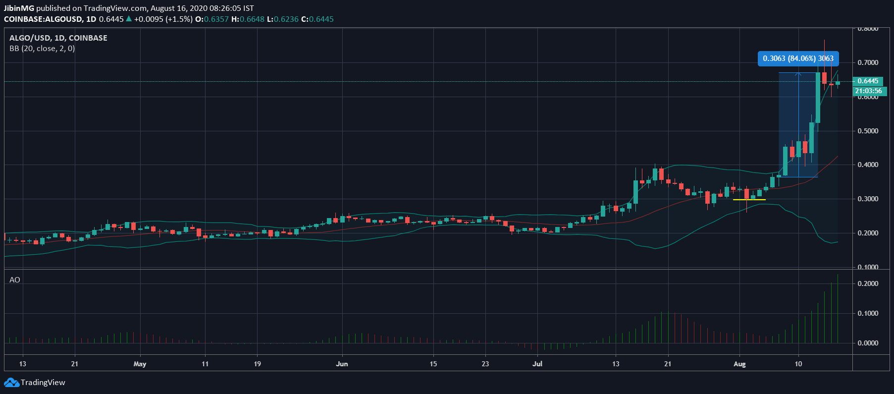 ألغوراند [ALGO]، العملة المشفرة في المرتبة 34 على CoinMarketCap ، كانت واحدة من أفضل الشركات أداءً في أغسطس ، حيث لاحظت ALGO ارتفاعًا بنسبة 85 ٪ تقريبًا في غضون أسبوع واحد فقط. بفضل الارتفاع المذكور أعلاه في السعر ، كان ALGO ، في وقت كتابة هذا التقرير ، يتداول الآن عند مستوى سعر كان آخر مرة لمسته في أغسطس 2019.