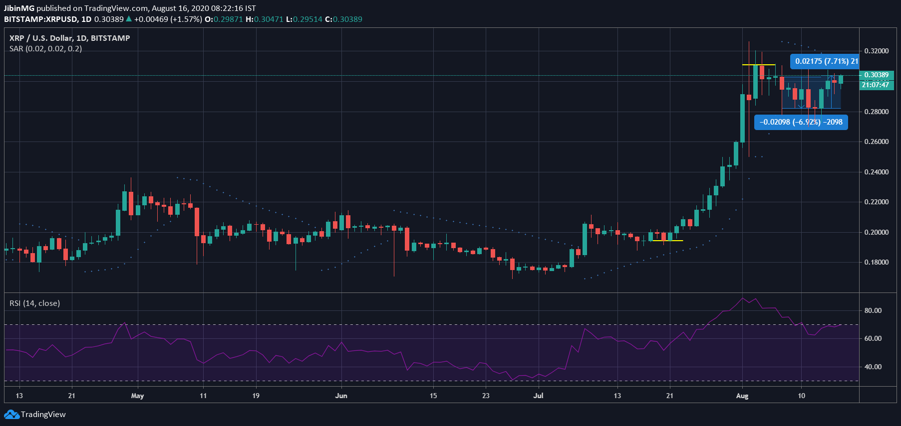 بالنسبة إلى XRP ، كان الأسبوع الأخير من شهر يوليو والأيام الأولى من شهر أغسطس شهيرين. لم تسجل العملة المشفرة فقط التعافي الذي تشتد الحاجة إليه على الرسوم البيانية ، ولكن بعد بضعة أسابيع من هبوط سلم CoinMarketCap ، استعادت العملة الرقمية مرة أخرى المركز الثالث على الرسوم البيانية ، متجاوزة Tether [USDT] فى المعالجة.