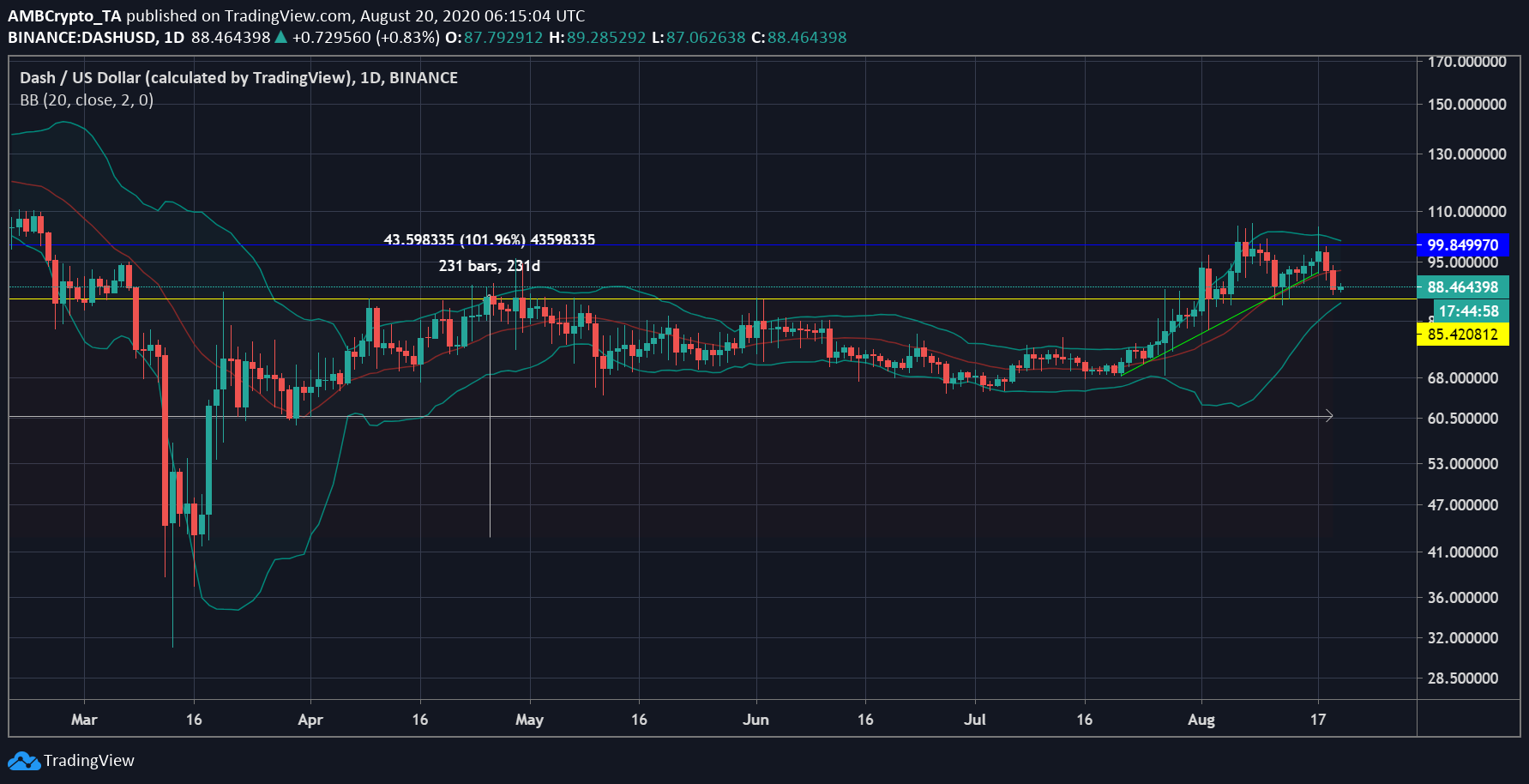 انفتح سوق عملة داش على عالم من التقلبات ، وأشار المرء بوضوح إلى اتساع نطاق البولنجر باند. ظلت التقلبات عالية في السوق منذ ارتفاع قيمته في منتصف يوليو. ومع ذلك ، منذ بداية شهر أغسطس ، كان سعر داش يرتد بين 99.84 دولارًا و 85.42 دولارًا. كانت نقطتا السعر بمثابة مستويات مقاومة ودعم قوية للعملة المعدنية ، ومع فشل إعادة الاختبار الثانية للمقاومة ، انقلب الاتجاه الصعودي في السوق إلى اتجاه هبوطي.