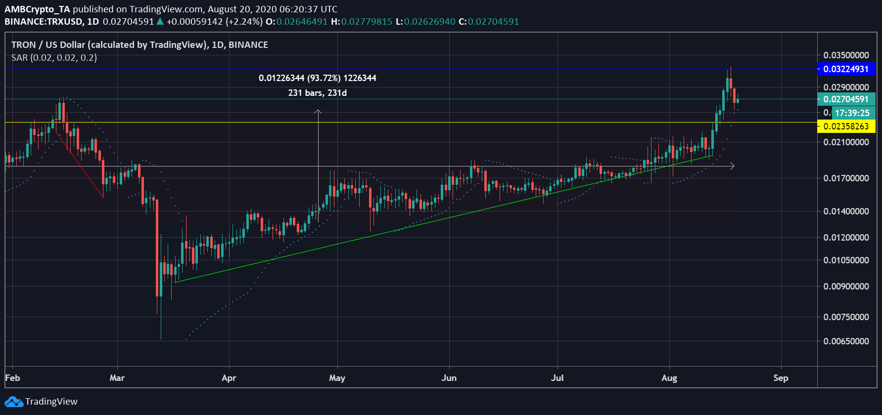 وفقًا للرسوم البيانية اليومية لـ TRX ، ارتفعت قيمة العملة المشفرة خلال الشهر الماضي ، قبل أن تنخفض عند اختبار مقاومتها عند 0.0322 دولار. لم يتم رؤية نقطة السعر هذه منذ يوليو 2019 ، ويمكن أن يؤدي الدفع أعلاه إلى تأكيد altseason القادم. على الرغم من أن سعر TRX قد تضرر بشدة خلال اليومين الماضيين ، إلا أن مكافئ SAR أشار إلى أن سعر العملة المشفرة لا يزال على استعداد للاتجاه الصعودي حيث كانت العلامات محاذية أسفل أشرطة الأسعار.