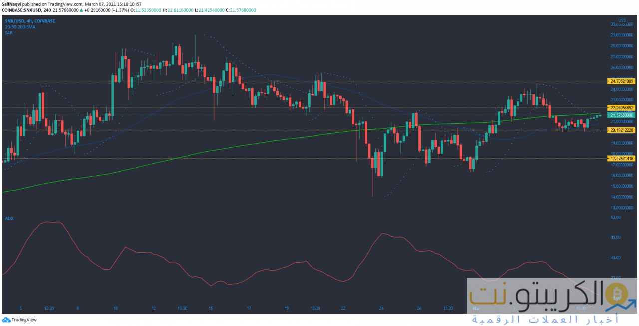 تحرك كاردانو بشكل أعمق في المنطقة الحمراء لكن المضاربين على الارتفاع احتفظوا بمستوى تصحيح فيبوناتشي 61.8٪ الحاسم. قدمت EOS ارتفاعًا إضافيًا من علامة 4 دولارات ولكنها احتاجت إلى الخروج من قناتها الضيقة. أخيرًا ، قد تواجه SNX معركة شاقة للارتفاع فوق 200-SMA بسبب أحجام التداول الصامتة.