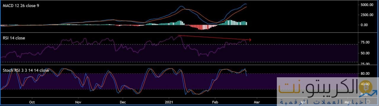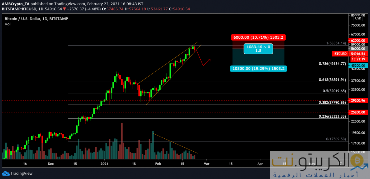كانت الـ 48 ساعة الماضية مضطربة لعملة البيتكوين. بعد الوصول إلى قمة 58354 دولارًا في الحادي والعشرين من فبراير ، انخفض الأصل حاليًا بنسبة 5 ٪ تقريبًا وتقدر قيمته حاليًا بـ 54916 دولارًا. ظلت القيمة السوقية لعملة البيتكوين أعلى من تريليون دولار ، لكنها قد تكون بداية تصحيح لأكبر الأصول الرقمية.