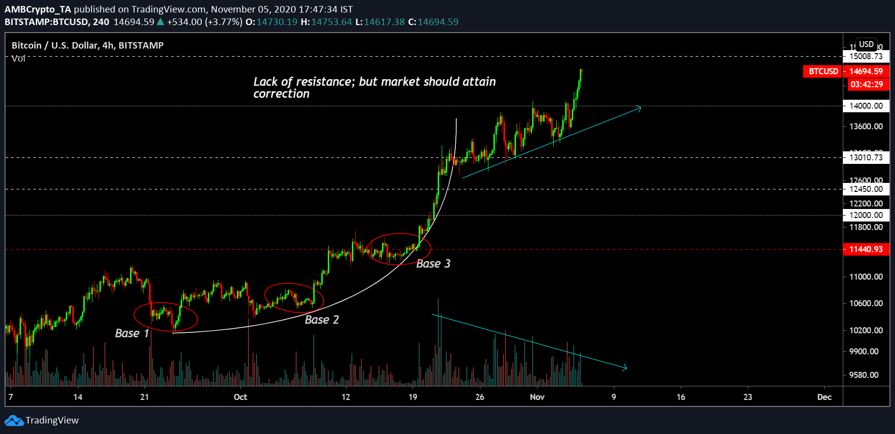 على مدار شهر أكتوبر ، تبع الارتفاع النيزكي لعملة البيتكوين من 10125 دولارًا منحنى مكافئ تصاعديًا. في حين أن الأصل كان يجب أن يمر بفترة من التصحيح بعد التوحيد فوق 13 ألف دولار ، استمرت BTC في المضي قدمًا ، مما أدى إلى إبطال المنحنى المكافئ في وقت النشر. الآن ، على مدار الأسبوع الماضي ، ارتفعت عملة البيتكوين بمقدار 1000 دولار أخرى ، ولا يزال الارتفاع الصعودي غير منزعج.