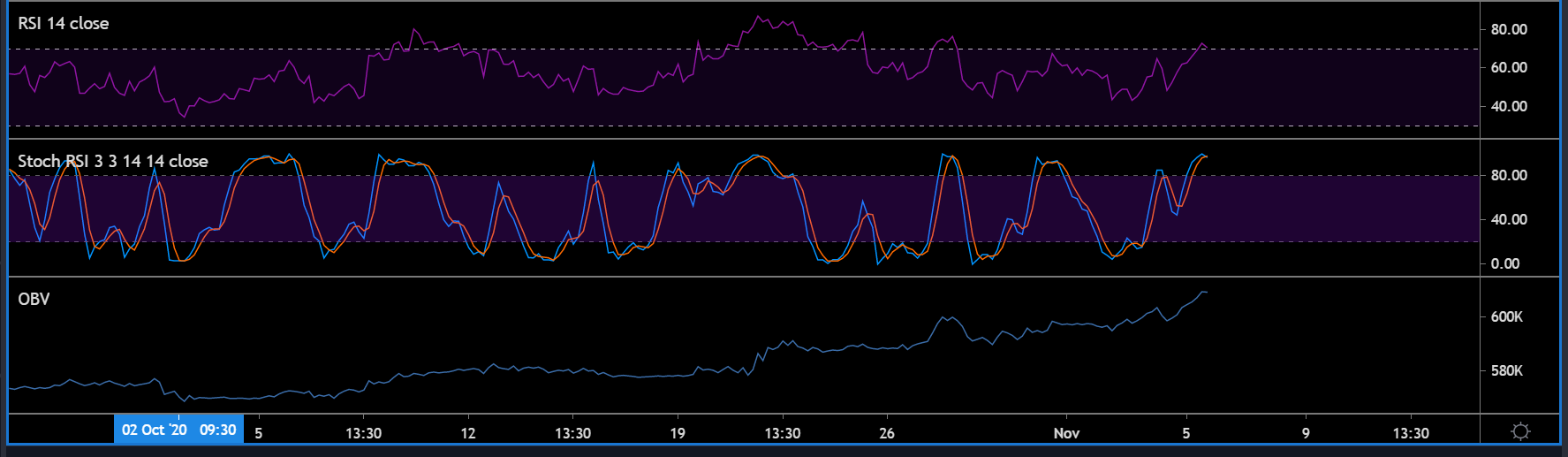 بينما لا يزال الاتجاه صاعدًا بشكل عام ، مؤشر ستوكاستيك مؤشر القوة النسبية يدل على تقاطع هبوطي. بينما يقع الخط الأزرق حاليًا فوق الخط البرتقالي ، فإن أي حركة تحت الإشارة في منطقة ذروة الشراء قد تضخ القليل من الزخم الهبوطي.