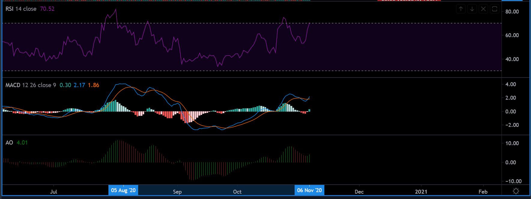 كانت مؤشرات السوق متناقضة بعض الشيء. يقوم مؤشر القوة النسبية أو مؤشر القوة النسبية حاليًا بإعادة اختبار مركز في منطقة ذروة الشراء ، وقد تحدث فترة تصحيح. مع ذلك ، من ناحية أخرى ، أكمل MACD تقاطعًا صعوديًا خلال الـ 12 ساعة الماضية ، ويبدو أنه يتوقع ارتفاعًا صعوديًا في المستقبل.