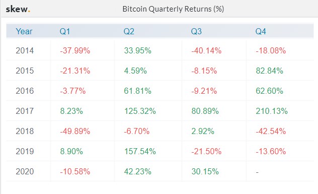 تظهر النظرة الكلية أن عملة البيتكوين قد حققت ربعين ناجحين بمتوسط زيادة بنسبة 36٪. علاوة على ذلك ، شوهد ربعان متتاليان آخر مرة في عام 2017 وتلاهما الإغلاق الأكثر انفجارًا بنسبة 210.13٪ في الربع الأخير.
