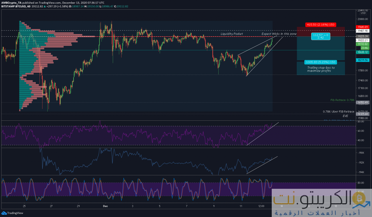يأخذ الرسم البياني المرفق في الاعتبار المؤشرات ، والتي بدت جميعها جيدة. ال RSI كانت في منطقة ذروة الشراء حيث بلغ سعر البيتكوين 19000 دولار بينما أظهر OBV ارتفاعًا جيدًا في الحجم يدعم ارتفاع الأسعار. مع ذلك ، أظهر مؤشر القوة النسبية الاستوكاستك عودة الدخول في منطقة ذروة الشراء أيضًا.