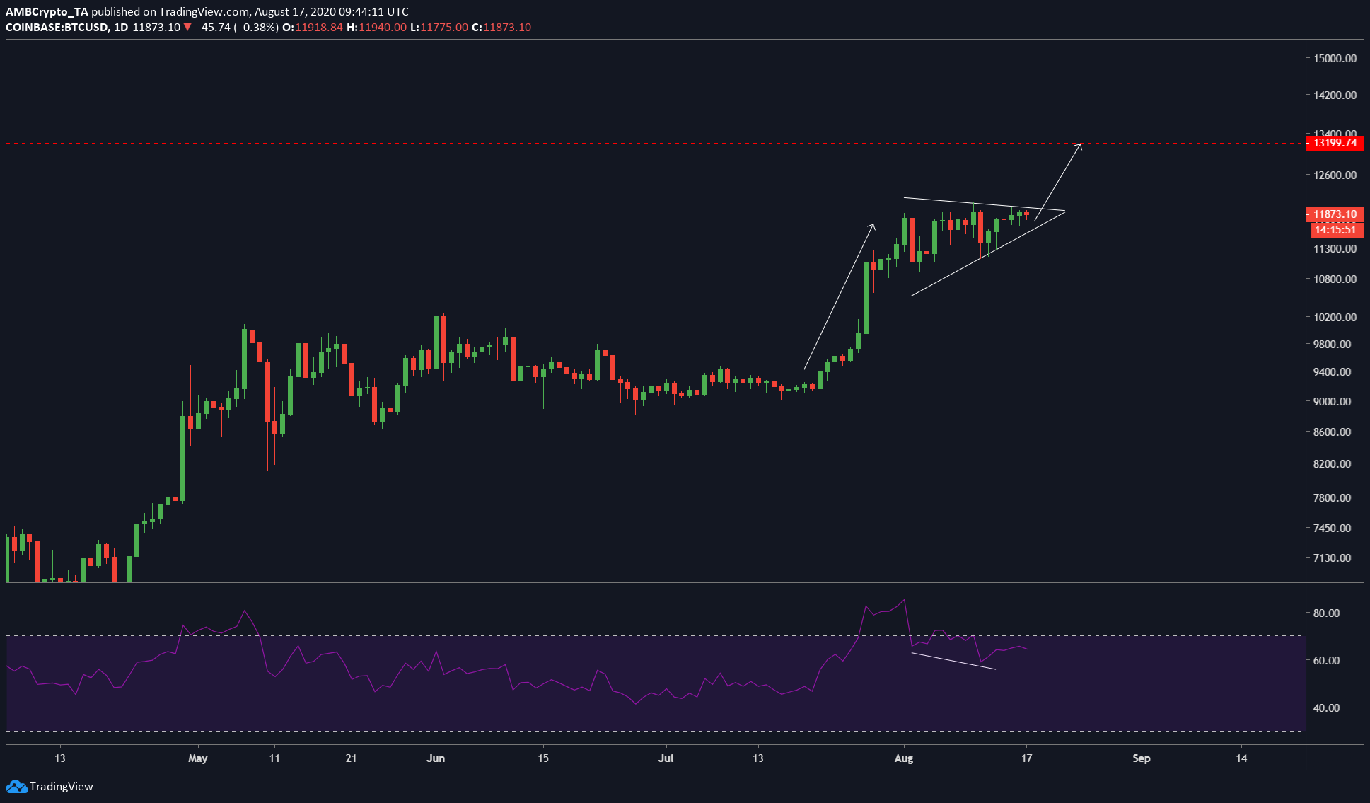 كان مؤشر القوة النسبية تحت منطقة ذروة الشراء بقليل ، ومع ذلك ، فقد كان يشير إلى تباعد صعودي. شكل السعر قيعان أعلى بينما شكل مؤشر القوة النسبية قيعان أعلى ؛ وبالتالي ، كان الاختلاف سببًا آخر لانتقال السعر من 11100 دولار في 12 أغسطس إلى سعر وقت النشر عند 11800 دولار – بزيادة قدرها 6٪.