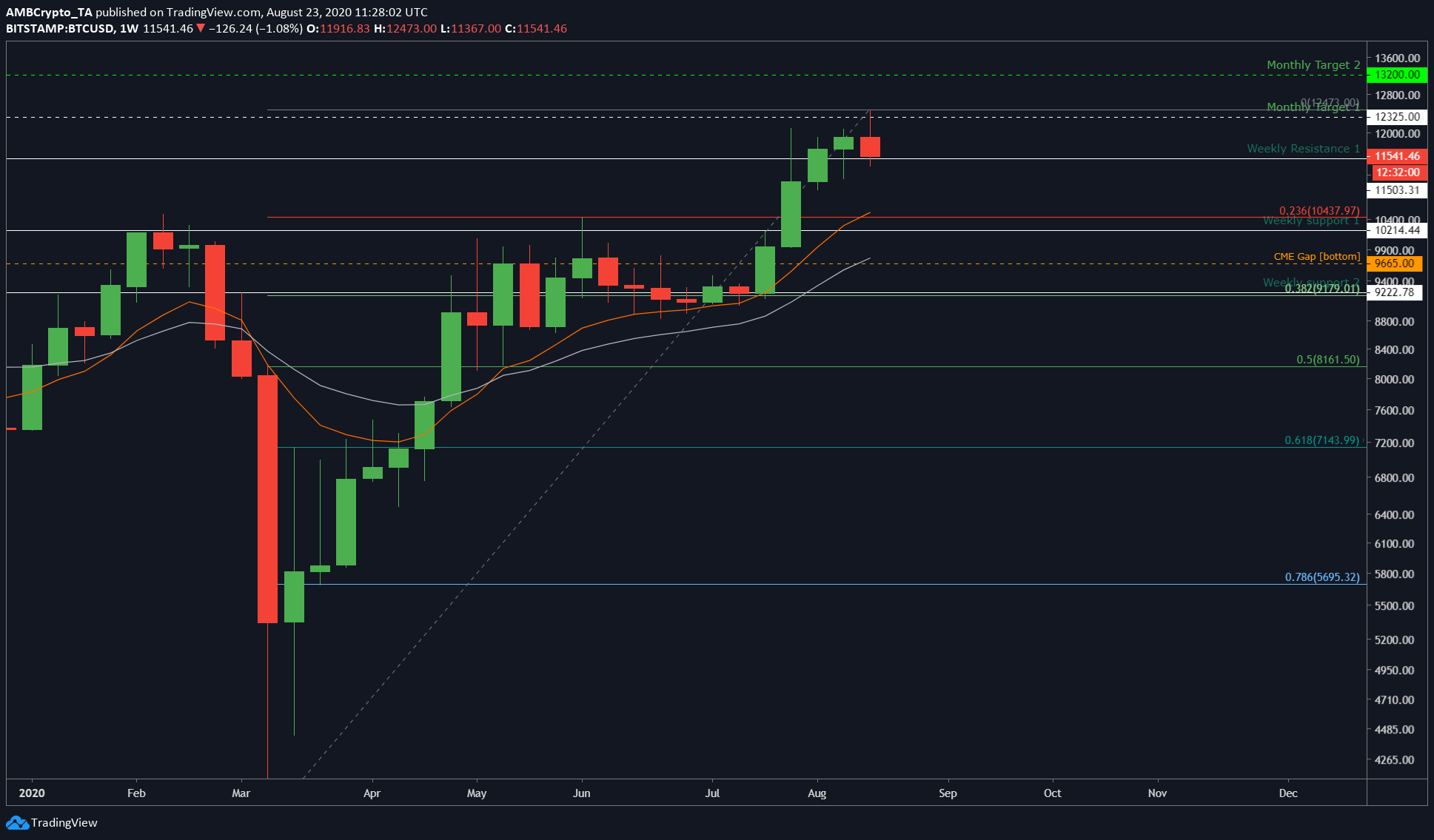 من الرسم البياني الأسبوعي ، يمكن ملاحظة أن عملة البيتكوين البالغة 12473 دولارًا كانت القمة المحلية وكذلك المقاومة الشهرية. كان 12473 دولارًا هو نقطة المقاومة التي منعت عملة البيتكوين من الارتفاع مرة أخرى في يونيو وأغسطس 2019.