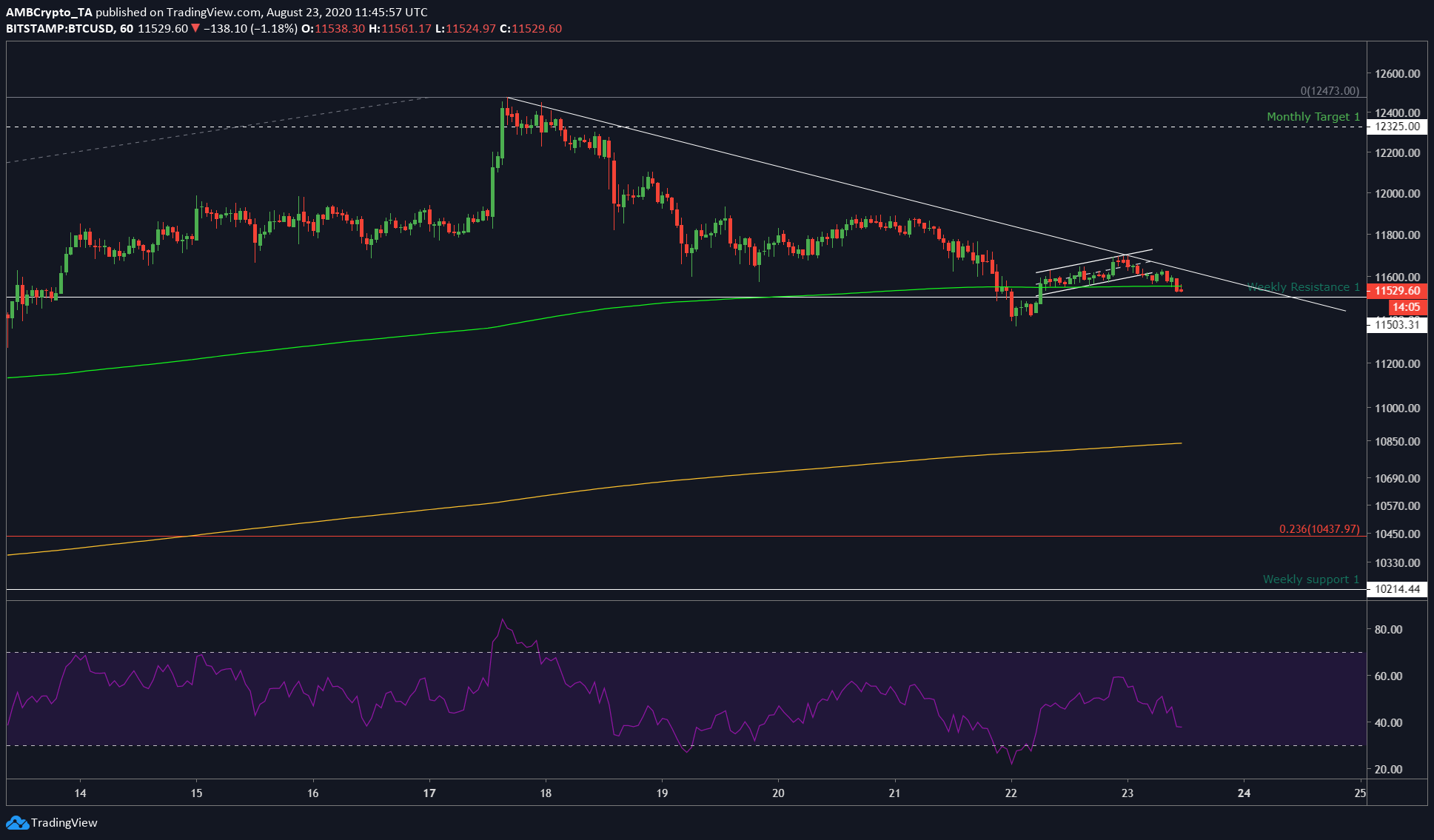 أظهر الرسم البياني قصير المدى لساعة واحدة أن الاختراق من مثلث البيتكوين الصاعد قد يأخذ العملة إلى المقاومة الأسبوعية التي سيتم اختبارها قريبًا عند 11503 دولارًا. المقاومة المنحدرة الممتدة من القمة المحلية عند 12،473 دولارًا تمنع السعر أيضًا من التوجه إلى الأعلى.