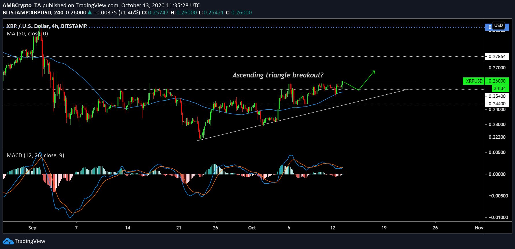 في حين أن الرسم البياني لـ4 ساعات قد لا يخبرنا عن الاتجاه الفوري خلال الساعات القليلة القادمة ، إلا أنه يشير حاليًا إلى اختراق الاتجاه خلال الـ 24-48 ساعة القادمة. كما لوحظ ، يقوم السعر حاليًا بمحاكاة نموذج المثلث الصاعد ، والذي قد يخضع لاختراق صعودي قوي في أي لحظة. بينما يحظى السعر بدعم كبير للمتوسط المتحرك الخمسين منذ بداية الأسبوع الماضي ، فقد ينخفض السعر قليلاً إلى 0.254 دولار مرة أخرى ، قبل الإقلاع.