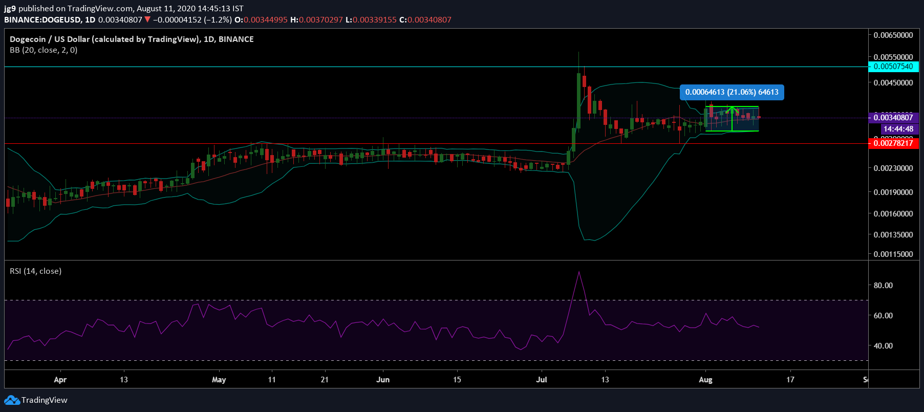 تقلص البولنجر باند بشكل كبير في عملة الدوجكوين ويشير إلى مستويات أقل من التقلب في السعر. من ناحية أخرى ، يتحرك مؤشر القوة النسبية RSI الآن بالقرب من منطقة ذروة الشراء.