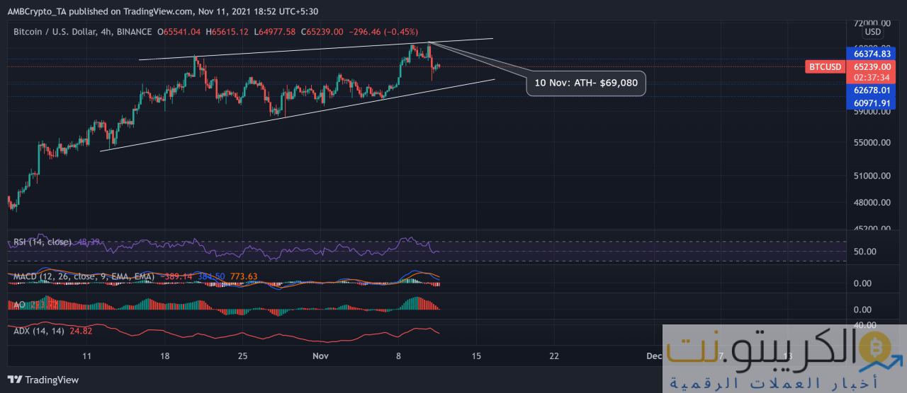 تمتعت Bitcoin بارتفاع مستمر خلال الأشهر الثلاثة الماضية وسجلت ما يقرب من 50 ٪ عائد استثمار خلال تلك الفترة. منذ 13 أكتوبر ، صعدت حركة السعر في وتد صاعد وسجلت نموًا شهريًا بنسبة 17٪ تقريبًا. واجه المضاربون على ارتفاع BTC بقوة الدببة وأظهروا هيمنتهم حيث وصل السعر إلى ATH في 10 نوفمبر عند 69،080 دولارًا.