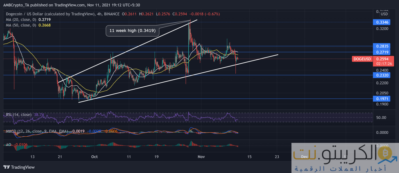 تأرجح سهم DOGE داخل إسفين صاعد منذ 26 سبتمبر. سجلت عملة meme أكثر من 15٪ عائد استثمار شهريًا. نتيجة لذلك ، لامس السعر البديل أعلى مستوى له في 11 أسبوعًا في 28 أكتوبر ثم شهد تراجعًا. نتيجة لذلك ، ارتد عائدًا من خط الاتجاه العلوي ووجد دعمًا عند 0.2320 دولار.