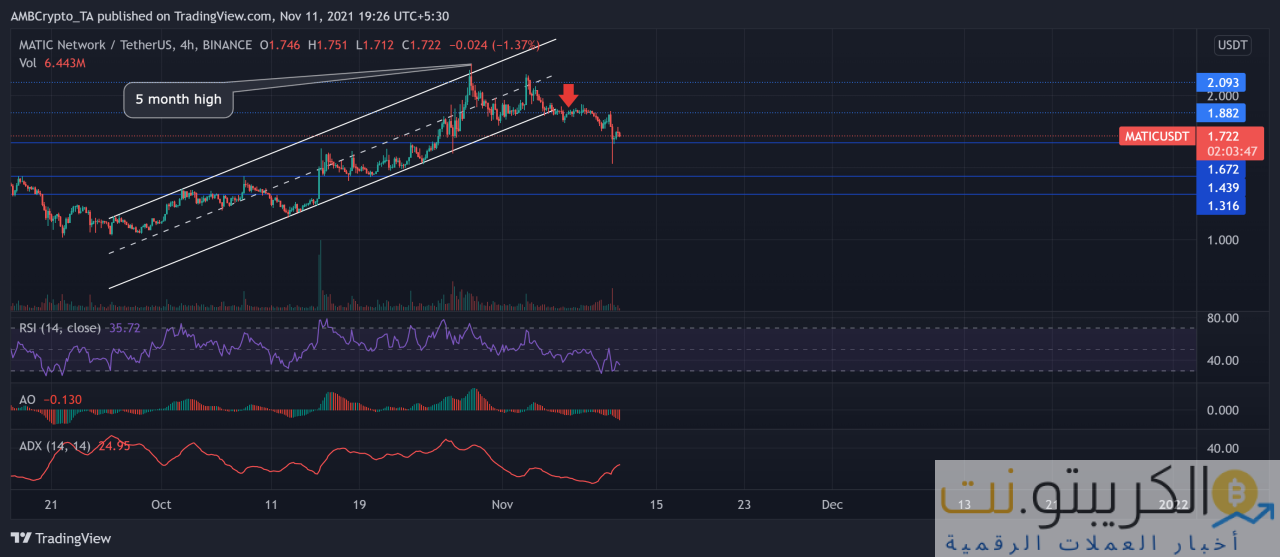 ومع ذلك ، شهدت العملة البديلة انخفاضًا بنسبة 6.4٪ خلال 24 ساعة و 15.3٪ خلال سبعة أيام. اخترقت حركة السعر الخط السفلي للقناة الموازية ووجدت دعمًا عند 1.672 دولار. صورت المؤشرات الفنية على المدى القريب زيادة قوة البيع. في وقت كتابة هذا التقرير ، تم تداول MATIC بسعر 1.722 دولار.