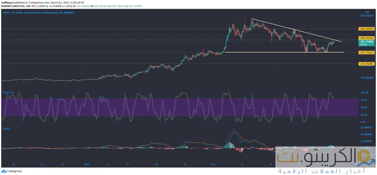 حقق Aave سلسلة من القمم المنخفضة على الرسم البياني للأربع ساعات بعد التراجع عن المستويات القياسية. نظرًا لأن المستوى 300 دولار كان بمثابة حاجز ضد انخفاض الأسعار ، فقد تشكل مثلث هبوط على الرسوم البيانية. ومع ذلك ، كانت أحجام التداول منخفضة ولم تكن متوافقة مع توقعات الاختراق ، في وقت نشر هذا التقرير.