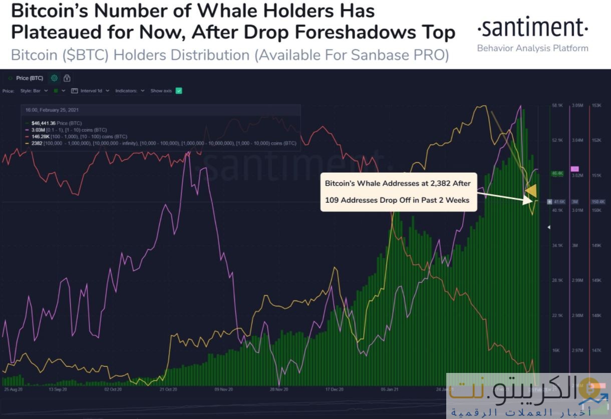 وفقًا لـ Santiment ، خرج أكثر من 100 حساب حوت من سوق BTC خلال الأسابيع القليلة الماضية ، مع بداية هذا الاتجاه عندما بدأت العملة في الصعود نحو ATH السابق الذي يزيد عن 56 ألف دولار ، قبل فترة طويلة من التصحيح الذي تم تحديده لاحقًا.