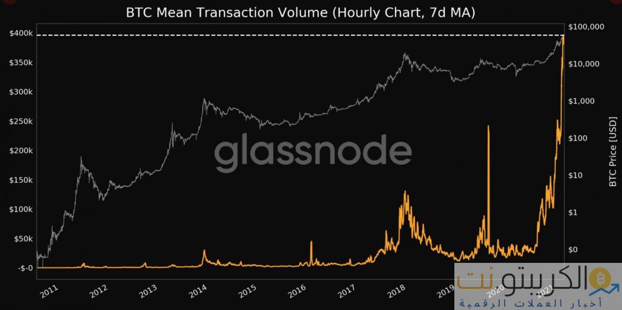 وفقًا لـ Glassnode ، ارتفع عدد العناوين التي تحتوي على 10 آلاف + عملات معدنية لتلامس أدنى مستوى في شهر واحد عند 93 ، وهو اكتشاف يوضح حقيقة أن الانخفاض الأخير في السعر ربما يكون ناتجًا عن حسابات ضخمة دفعت ضغط البيع شمالًا. ومع ذلك ، على الجانب العلوي ، ارتفع متوسط حجم المعاملات لـ BTC لإنشاء ATH جديد بقيمة 396،077.77 دولارًا ، وفقًا لمنصة تحليل البيانات.