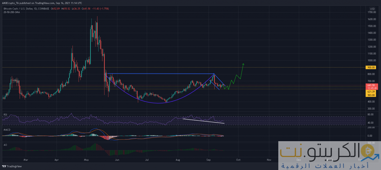 إذا كان نمط الكوب والمقبض الخاص بـ BCH يعمل كما هو متوقع ، فسوف يقفز السعر إلى ما بعد 900 دولار في الأسابيع القادمة. في غضون ذلك ، يمكن للمتداولين شراء بيتكوين كاش بمجرد انخفاض السعر بين 583 دولارًا و 621 دولارًا.