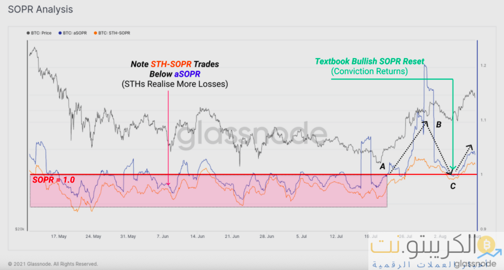 بالنظر إلى المستوى المحلي العالي الذي حققته aSOPR مؤخرًا ، يمكن للمرء أن يستنتج أن العملات المعدنية المربحة استفادت من قوة السوق لتحقيق الأرباح. مع تحوم المقياس مرة أخرى حول 1 مرة أخرى ، يمكن القول أن العملات المعدنية المربحة لم تعد تُنفق وقد وجد الاقتناع طريقه مرة أخرى. بالإضافة إلى ذلك ، تجدر الإشارة إلى أن STH-SOPR ظلت دائمًا أقل من aSOPR وهذا يدل على حقيقة أن HODLers على المدى القصير قد حققوا المزيد من الخسائر مقارنة بنظرائهم الآخرين.