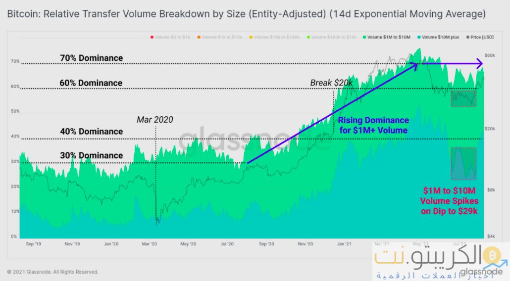من الواضح أن هيمنة المعاملات الكبيرة تتزايد في كل من الأطر الزمنية الكلية والجزئية. منذ سبتمبر من العام الماضي ، ارتفعت هيمنة هذه المعاملات كبيرة الحجم من 30٪ إلى 70٪ من إجمالي القيمة المنقولة. بقدر ما يتعلق الأمر بالمدى القريب ، شهدت مجموعة المعاملات التي تتراوح من مليون دولار إلى 10 ملايين دولار ارتفاعًا ملحوظًا عندما كان سعر البيتكوين يتأرجح في المنطقة المنخفضة التي تبلغ 30 ألف دولار في أواخر يوليو. بالإضافة إلى ذلك ، في الأسبوع الماضي ، شهدت هيمنة فئة الحجم التي تزيد عن 10 ملايين دولار ارتفاعًا ملحوظًا في الهيمنة بنسبة 20 ٪ ، وبالتالي حافظت على ارتفاع BTC.