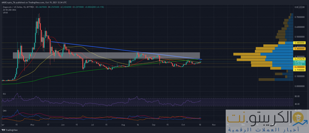 ومع ذلك ، ضع في اعتبارك أن تقدم أسعار DOGE يحتاج إلى دعم بأحجام متسقة وإلا فإن بعض الرياح الخلفية يمكن أن تبدأ في التسلل إلى السوق. في وقت كتابة هذا التقرير ، تم تداول DOGE عند 0.247 دولار ، بانخفاض 3.5٪ خلال الـ 24 ساعة الماضية.
