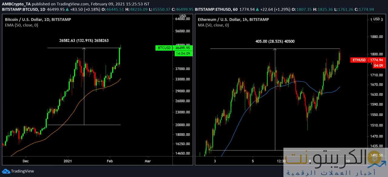 كان السرد متشابهًا للغاية بالنسبة لأفضل اثنين من الأصول الرقمية في السوق على مدار الشهرين الماضيين. استمتاعًا بحجم الزخم الصعودي في السوق ، قام مستثمرو Bitcoin برفع ضغط الشراء على مدار الـ 24 ساعة الماضية بعد أن أعلنت Tesla عن استثمار احتياطي رأس المال بنسبة 7.7 ٪. في الواقع ، بعد بضع ساعات فقط ، صعدت عملة البيتكوين لتصل إلى مستوى مرتفع جديد فوق 48000 دولار ، مع اختراق Ethereum أيضًا علامة 1800 دولار التي طال انتظارها.