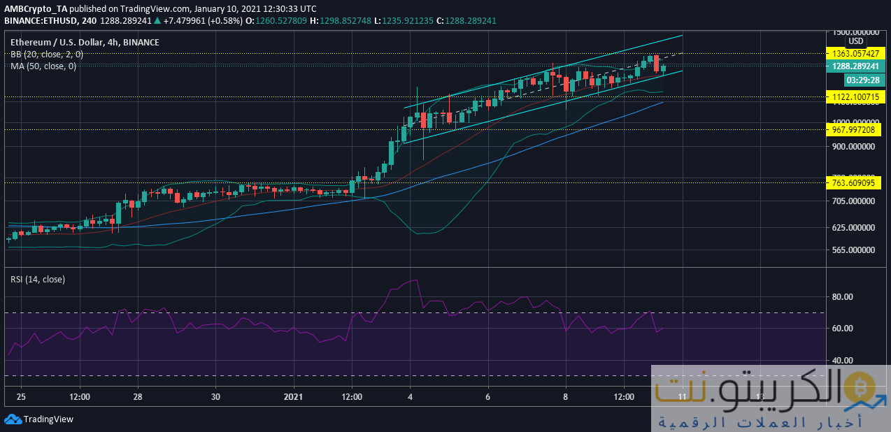 حدد الرسم البياني أعلاه الدعم عند 1،122 دولارًا أمريكيًا بينما لوحظت المقاومة بالفعل عند 1،363 دولارًا. كان سعر ETH يتحرك داخل هذا النطاق خلال اليومين الماضيين. ومع ذلك ، فإن القناة الصعودية الممتدة عبر الرسم البياني قد قدمت دعمًا لقيمتها ، وبالتالي قد لا يكون الانخفاض هو الخطوة التالية في سوق ETH.