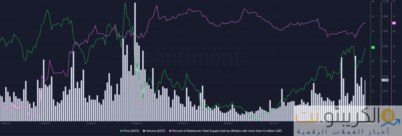 قدمت المقاييس على السلسلة والبيانات التي يحركها السعر سردًا صعوديًا للغاية لـ DOT حيث شهد مؤشر القوة النسبية على الرسم البياني اليومي ارتفاعًا عموديًا تقريبًا. والجدير بالذكر أنه اعتبارًا من 7 سبتمبر فصاعدًا ، شهدت زيادة حادة في نسبة DOT في المعروض من العملات المستقرة التي تحتفظ بها الحيتان بأكثر من 5 ملايين دولار أمريكي ارتفاعًا هائلاً.