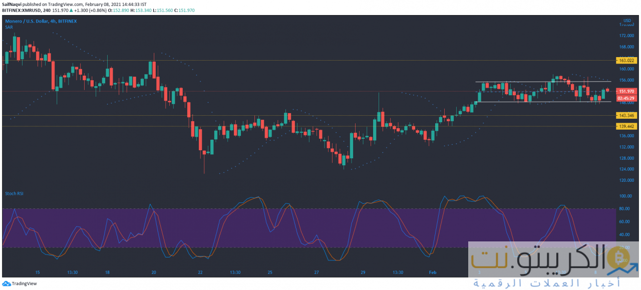من ناحية أخرى ، فإن مكافئ SAR تحركت العلامات المنقطة فوق الشمعدانات وقدمت إشارات بيع على XMR. في حالة التحرك باتجاه الجنوب ، تقع مناطق الدعم التالية عند 143.3 دولارًا و 139.4 دولارًا.