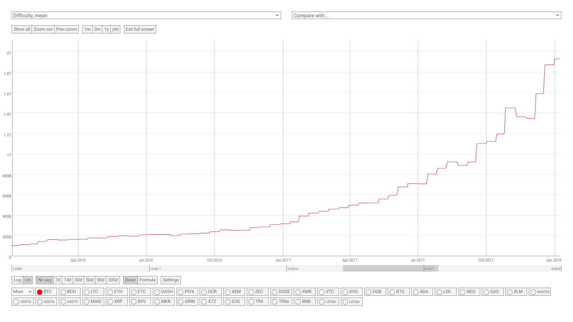 كانت S9s Antminer في صدارة اللعبة عند إطلاقها في عام 2016 وهي موجودة حتى الآن ، على الرغم من زيادة معدل التجزئة والصعوبة في Bitcoin. تم تسعير S9s بسعر 2100 دولار أمريكي وكانوا يقومون بـ 13.5 TH / s ويظهر مخطط صعوبة الشبكة النمو الأسي بين عامي 2016 و 2018.