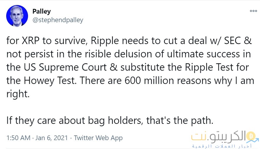في الآونة الأخيرة ، شارك محامي العملة الرقمية في Anderson Kill ، ستيفن بالي ، رأيه حول كيفية بقاء XRP طوال مدة وتداعيات المعركة القانونية. محامي التشفير يعتقد أن Ripple ستحتاج إلى التوصل إلى تسوية مع SEC لأنه وفقًا لـ Palley ، فإن السيناريو الذي ستفوز فيه Ripple بالدعوى ، وتحل محل اختبار Howey مع معرف قانوني جديد آخر للعملات المشفرة هو “وهمي”.