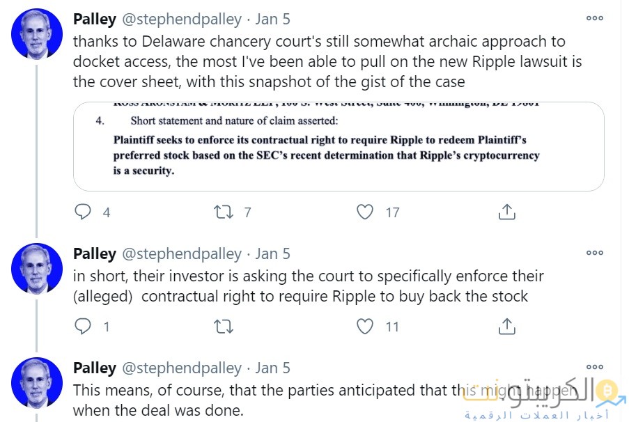 بالإضافة إلى ذلك ، استعرض Palley دعوى قضائية أخرى مؤخرًا ضد Ripple ، والتي رفعتها شركة الاستثمار البريطانية Tetragon. قالت المجموعة المالية إنها تسعى إلى “إنفاذ حقها التعاقدي في مطالبة Ripple باسترداد” الأسهم المفضلة من السلسلة C التي تحتفظ بها الشركة.