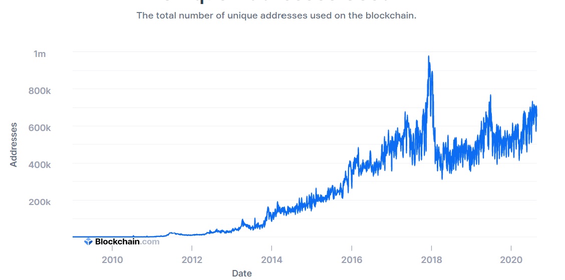 هناك نمط يظهر عندما يرى المرء كل هذه الأمثلة واحدة تلو الأخرى. بالنسبة للمبتدئين ، قد يكون معظم هؤلاء المؤيدين مخطئين بشأن مدى تقدم البيتكوين والعملات المشفرة في دورة التبني. تتأرجح عناوين محفظة Bitcoin الفريدة ، على سبيل المثال ، بين نطاق 400k و 600k لمعظم السنوات الثلاث الماضية ، على الرغم من اكتساب Bitcoin اهتمامًا في جميع الفصول.