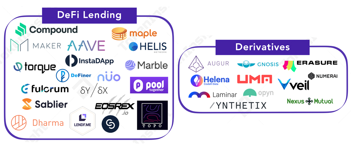 بالنسبة الى احصائيات من Defi Pulse ، تتضمن أفضل ستة منصات defi Maker (إقراض) ، مركب (إقراض) ، Synthetix (مشتقات) ، Aave (إقراض) ، Instadapp (إقراض) ، و Curve Finance (dex).