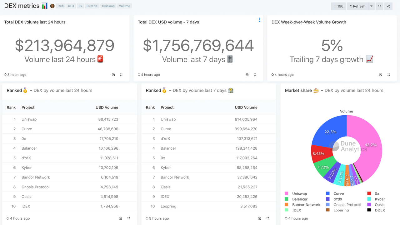 تظهر بيانات Dune Analytics أن منصات dex شهدت تداولات بقيمة 213 مليون دولار خلال الـ 24 ساعة الماضية. كان هناك 1.7 مليار دولار في حجم التجارة خلال الأيام السبعة الماضية ، وقفز النمو بنسبة 5٪ هذا الأسبوع حتى الآن.
